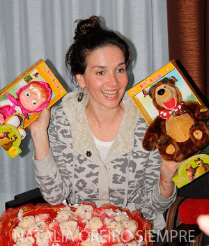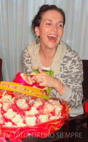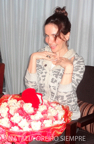 Далее по законам жанра следовал подарок для мужа и при словах «para Ricardo», Нати несказанно обрадовалась и сказала, что он и сынишка спят (тем самым дала понять, что они наверняка не догадываются, что помимо нее, поклонники приготовили сюрприз и её близким). Коллекция русского рока, охватывающая разнообразные направления данного вида музыкального искусства в России, Нати очень заинтересовала и она аккуратно и с большим любопытством рассмотрела каждый диск и закрыв их в подаренной коробочке поставила рядом с собой. Наш админ (Лена Губанова) подарила статуэтку ручной работы из глины в образе Чолито (сериал «Дикий ангел»), от которой Нати пришла в восторг! Лена пообещала в будущем целую коллекцию глиняных статуэток - образы Мониты (сериал "Ты моя жизнь"), Аманды (сериал «Аманда О») и так далее. Участница нашей группы (Маша) тоже преподнесла необычные подарки для сынишки и его мамы, среди которых были: книжки с русскими сказками на испанском языке и килограмм гречки, да, для нас это удивление «Зачем?», но в Аргентине, увы, гречку не выращивают и не продают и многие жители даже не предполагают, что такое зерно существует! Наша Вика, на днях прилетевшая из Германии, тоже привезла приятные сюрпризы и сувениры для Нати, среди которых был любимый Нати шоколад. Я, по просьбе нашей участницы Анны (которая, к сожалению, не смогла приехать на концерт, потому что находится в инвалидном кресле), передала Нати от её имени глиняную статуэтку Альфа с письмом (к слову сказать, Нати передала именной автограф для Ани), также по просьбе очень большого поклонника Нати, бойца русского спецназа, Василия, я подарила Нати огромный холст с её изображением в образе Моны Лизы, тут просто нельзя не описать восторг Нати, видно было её удивление и изумление, так как такого подарка она точно не ожидала,помимо этого ещё был передан бальзам, произведенный по старинной рецептуре,которой более 26 веков,оформленный в древно-греческий сосуд.
