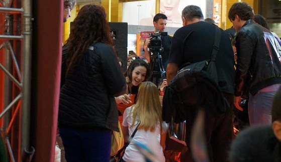 2 день. Самый ярко-запоминающийся денек))). В ТЦ Галерею мы пришли рано, где-то около 11,чтобы как полагается разведать обстановку посмотреть что и как, и по возможности где-то в одном месте собрать нашу группу. По факту многие наши участники собрались в одном месте, а именно, слева от импровизированной сцены, ближе к ступенькам, по которым поднималась Нати на автограф-сессию).С каждой минутой людей прибывало и к 14:00 обстановка накалилась до такой степени, что при малейшем упоминании Нати (будь то слово ведущей или первые аккорды из песни Cambio Dolor),вся толпа начинала движение к сцене. Здесь следует отметить, что перед сценой было 2 ряда стульев, которые предназначены были для СМИ, потому как организаторы решили провести мини-пресс-конференцию, потом разыграть билеты на Супердискотеку, ну и сама автограф-сессия. И вот минут через 20-30 появилась Нати в великолепном платье из последней коллекции Las Oreiro под песню Cambio Dolor, поклонники и фанаты очень громко приветствовали её, так что припев песни Нати спела в микрофон и только после : «Добрый день! Как дела? Поцелюй! Я очень рада!» она присела и приготовилась отвечать на вопросы. Рядом с Натиком за столом сидела переводчица Мария, предоставленная организаторами мероприятия на время проведения автограф-сессии. Конечно не хочу сильно критиковать, но все же выскажу свое субъективное мнение, переводчица была не квалифицированная, не владеющая языком и многое из слов Натика коверкала на свой лад, про знание творчества самой Нати я вообще молчу, потому как кроме «Мунэка Брава» она не смогла никак перевести сериал «Дикий Ангел», а фильм «Мисс Тукуарембо»,она просто назвала новым фильмом (!?),ну и много других ляпов было, не позволительных квалифицированному специалисту. Но вернемся к Натику). Первый из вопросов был - ожидала ли Наталия, что ее не забыли или это было для неё сюрпризом? Нати сказала: « Что очень рада вернуться в Россию спустя столько лет. Я думала вы меня уже забыли», после ее слов вся Галерея взорвалась бурным приветствием или скорее громогласным криком подтверждающим, что ее любят и помнят. И только после этого Нати заметила, что люди столпились не только возле импровизированной сцены, но еще очень много на верхних этажах и она к ним обратилась «Hola!!! Никто мне не говорил, что так много людей там наверху.!»и помахала, казалась каждому из присутствующих там.