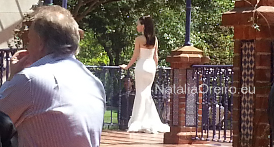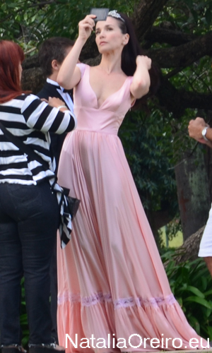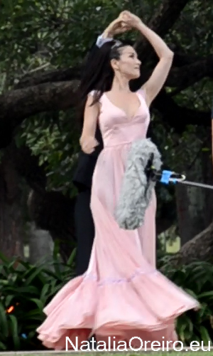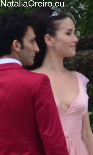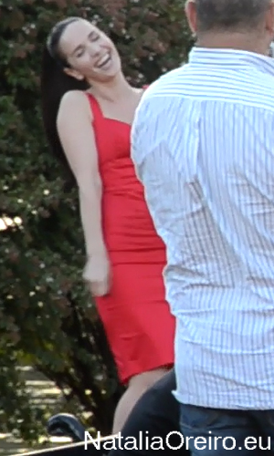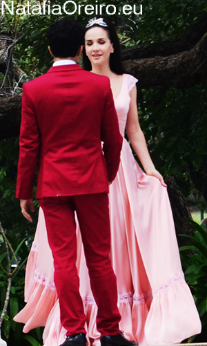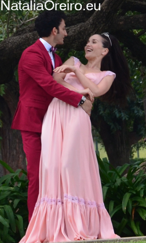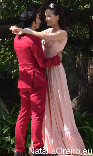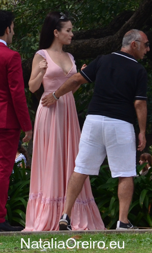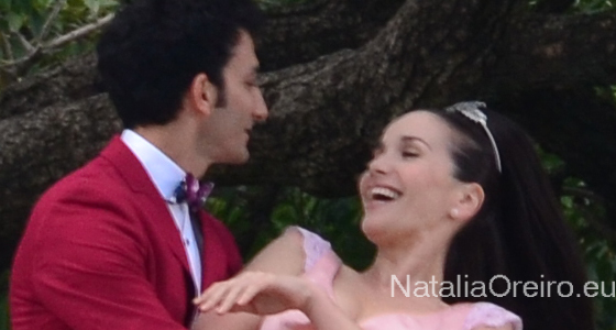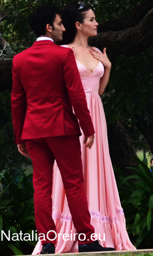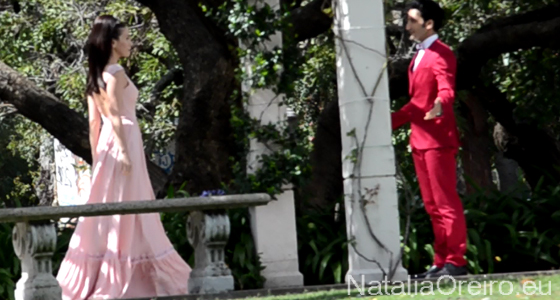 Нати С Адрианом должны были подняться по лесенке в несколько ступенек и пройти к фонтанчику. Сделав пару шагов, Нати запнулась за платье, засмеялась, чем вызвала море позитива на съёмочной площадке, т.к. когда она смеётся, то хочется смеяться с ней!