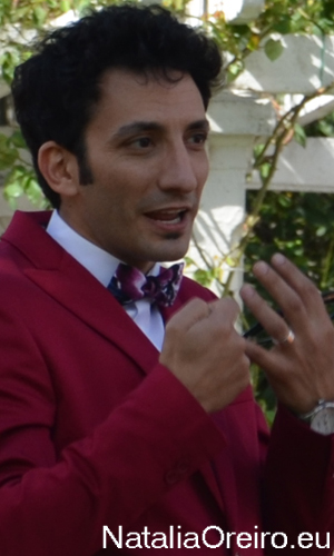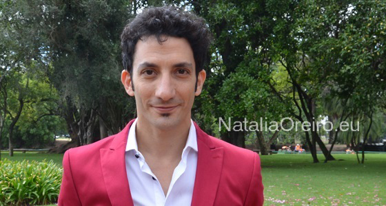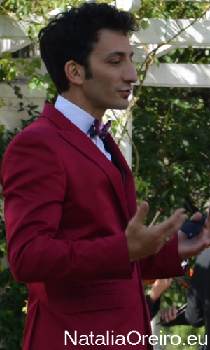 По ощущениям пролетело совсем мало времени, но оказалось, уже был час дня, т.е. обед и время посещения малыша Мерлина и Рикардо. Нати убежала в гримёрку, а мы остались в парке. Следующие сцены были в другой части парка, поэтому всю технику стали собирать и перевозить туда. Мы решили погулять по парку роз, ведь он был совершенно пустой, когда ещё можно прогуляться там в совершенном спокойствии среди благоухающих роз. Мы медленно плелись по дорожке, обсуждая и переваривая впечатления от процесса съёмки. Получилось, что мы вырулили из-за улового куста на просматриваемую тропинку среди роз. И увидели, что нам на встречу идёт Хуан Минухин. Вокруг вообще никого не было и т.к. мы довольно неожиданно вывернули из-за куста, то Минухин аж заозирался по сторонам, ища поддержку или способ увильнуть. Но ни товарищей, ни способа свернуть с тропинки у него не оказалось, так он и продолжил свой путь на нас. Оказался очень милым в общении, сфоткался со всеми и отдельно для сайта, мило поболтали. Вручили шоколадку и брелок с матрёшкой и отпустили восвояси. (Уже через пару дней Нати нам сказала, что ему было очень приятно и что он хвастался, что ему подарили подарки. Нам стало немного жалко Адриана, что у нас как-то не получилось к нему подойти, и мы передали через Нати и ему пару подарков).