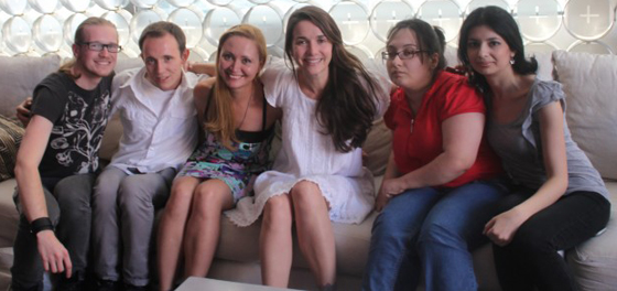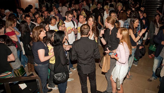 Фойе разделили на две части. С одной стороны была раскатана красная дорожка. Более наряженые гости проходили сразу в зал и занимали места. Мы тоже зашли. Зал был ещё почти пустой, и мы смогли выбрать места в самой середине в большом проходе. Посидев ещё минут 20, я всё-таки решила пойти посмотреть, что проиcxодит в фойе. Попросив нового товарища посторожить место, явышла из зала. Было уже людно и шумно. Народ болтал и ждал появления "звёзд". Окинув взглядом толпу я заметила парня из Чехии Мэтта, которого узнала по фотографиям из аэропорта. Решила подойти, познакомиться. Оказалось, что с ним были ещё 3 поклонницы из Румынии и парень из Польши. Проболтали мы с ними ещё очень долго, минут 40 точно, если не целый час!